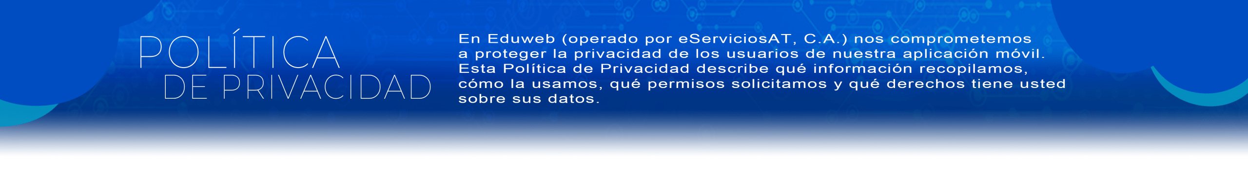 En Eduweb (operado por eServiciosAT, C.A.) nos comprometemos a proteger la privacidad de los usuarios de nuestra aplicación móvil. Esta Política de Privacidad describe qué información recopilamos, cómo la usamos, qué permisos solicitamos y qué derechos tiene usted sobre sus datos.